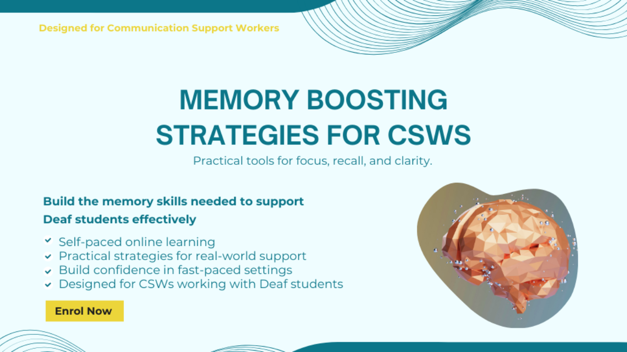 Whether you’re a Communication Support Worker (CSW), LSA, teacher, tutor, job coach, or anyone working with Deaf people, this CPD-accredited online course provides practical strategies and tools to improve recall, manage mental load, and stay focused in fast-paced support settings. Price: £49.00 plus VAT.